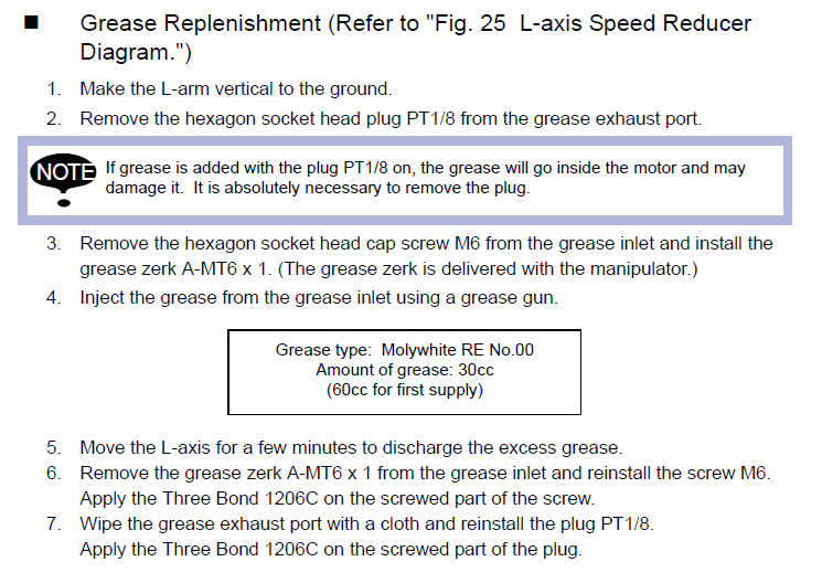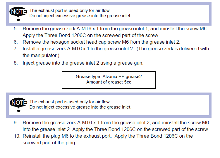 Grease Procedure (PM) EA1900N / YR-EA1900N-A00 Manipulator September 22, 2025 18:17 Updated Model Covered: YR-EA1900N-A00 Material Required:Molywhite RE No. 00 132412-1Harmonic Grease 4B No. 2 140087-2Harmonic Grease SK-1A 479035-2Alvania EP Grease 2 132177-1ADHESIVE, GASKET, LIQUID, 200 GRAM TUBE, THREEBOND 1206C 479014-6 Related articles Grease Procedure (PM) EA1900N / YR-EA1900N-A01 Manipulator Preventative Maintenance DX100 MA1900 YR-MA01900-A00 Manipulator Battery Replacement EA1900N / YR-EA1900N-A00 Manipulator Grease Procedure (PM) MA1400 / YR-MA01400-A00 Manipulator Comments 0 comments Please sign in to leave a comment.