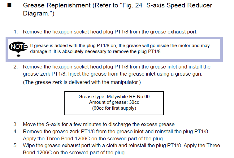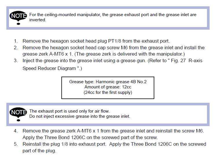 Grease Procedure (PM) EA1900N / YR-EA1900N-A10 Manipulator September 22, 2025 18:22 Updated Model Covered: YR-EA1900N-A10 Material Required:Molywhite RE No. 00 132412-1Harmonic Grease 4B No. 2 140087-2Harmonic Grease SK-1A 479035-2Alvania EP Grease 2 132177-1ADHESIVE, GASKET, LIQUID, 200 GRAM TUBE, THREEBOND 1206C 479014-6 Related articles Grease Procedure (PM) EA1900N / YR-EA1900N-A11 Manipulator Comments 0 comments Please sign in to leave a comment.