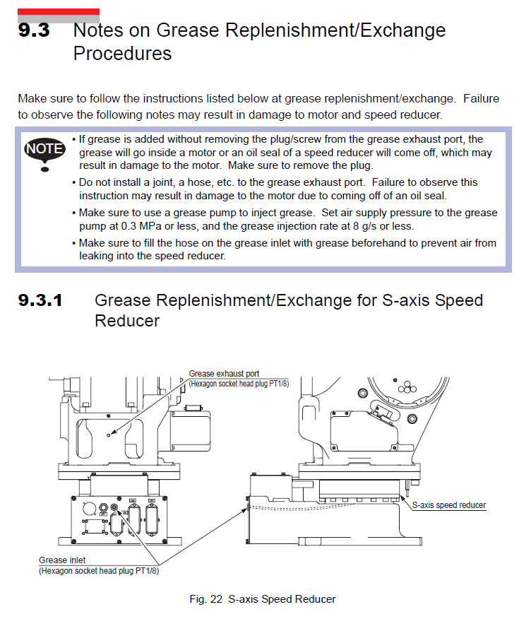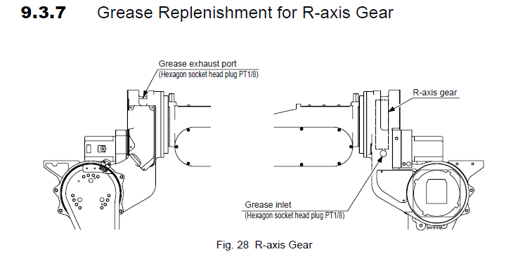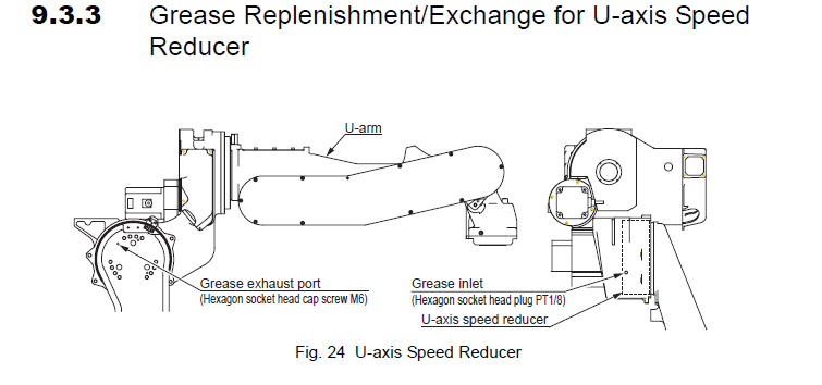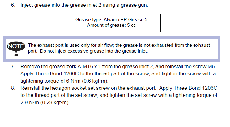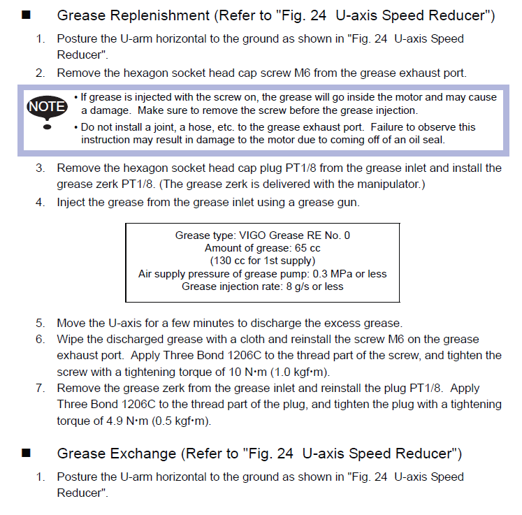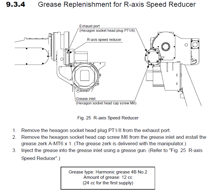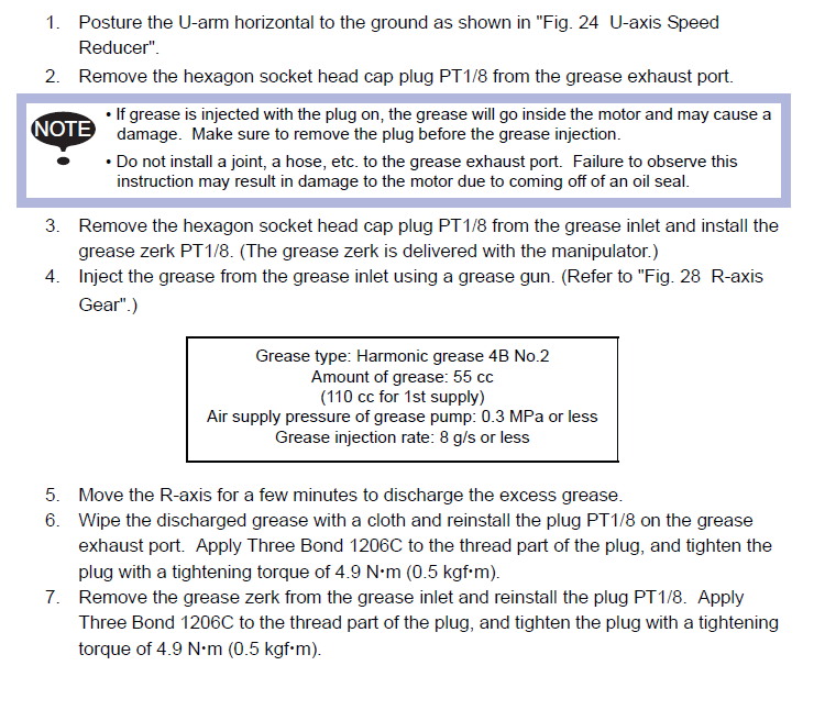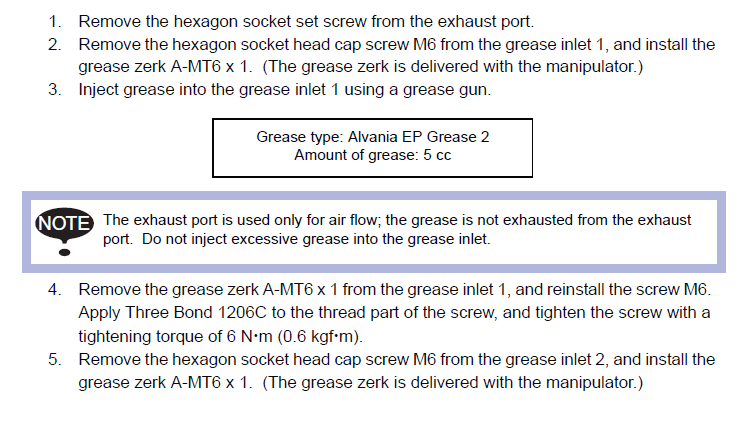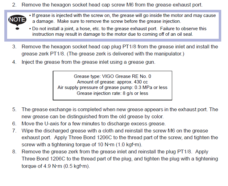 Grease Procedure (PM) EA1800N / YR-EA1800N-A01 Manipulator September 23, 2025 14:43 Updated Model Covered: YR-EA1800N-A01 Material Required:VIGO Grease RE No. 0 151945-1Harmonic Grease 4B No. 2 140087-2Grease SK-1A 479035-2Alvania EP Grease 2 132177-1Three Bond 1206C 479014-6 Related articles Sending an Output During a MOV Battery Replacement EA1400N / YR-EA1400N-A00 Manipulator Battery Replacement EA1800N / YR-EA1800N-A01 Manipulator Battery Replacement EA1900N / YR-EA1900N-A00 Manipulator Comments 0 comments Please sign in to leave a comment.