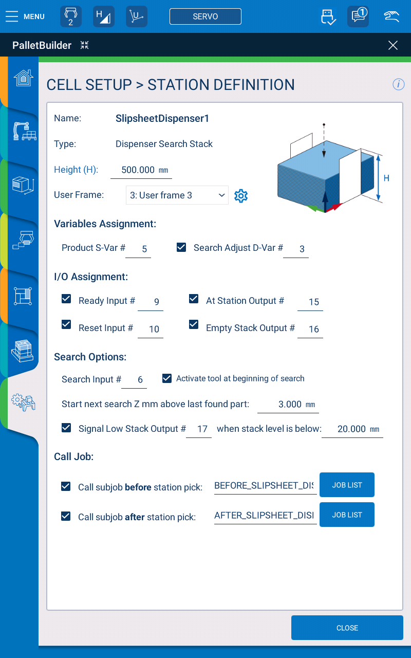 If the robot reaches the taught pick position for the Dispenser Search Stack without finding product, the robot will deactivate the gripper and finish executing the Dispenser Pick Departure path. It will then set the Search Adjustment D-var to 0 and turn on the Empty Stack Output# before executing the Call subjob after station Pick: (if enabled). Make sure to check the Search Input# inside this subjob before assuming that product has been grabbed.