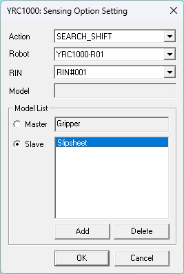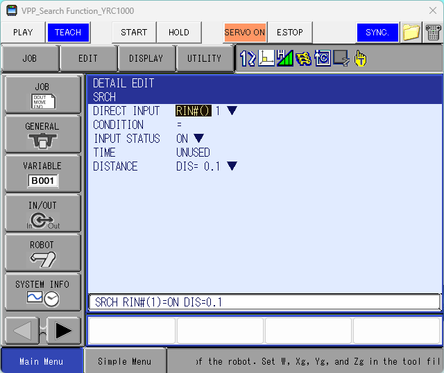 Make sure the same RIN# is used as configured in the Sensing Option Function. Modify the other settings as displayed below. Reference the YRC1000: Search Function manual for further information on how this function works.