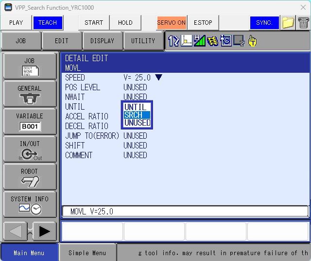 Next, teach a MOV command in a job that results in the robot moving the Master model through the Slave model to reach the taught position. Open the Detail Edit window on the taught MOV command and click on the "UNTIL" property. Select "SRCH" from the list.