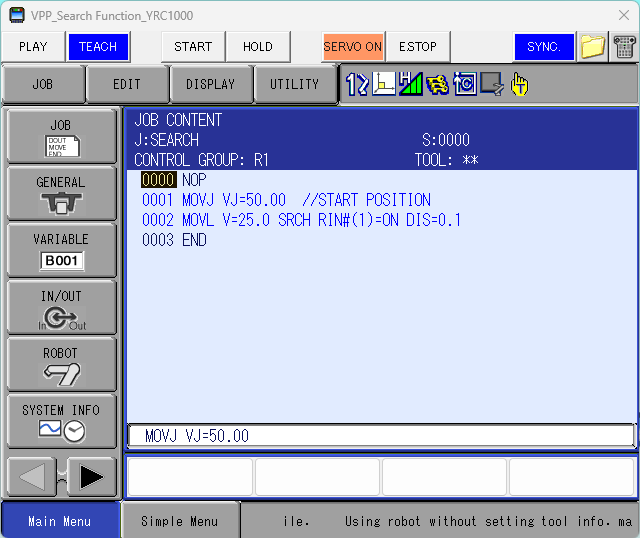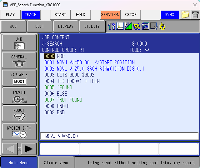 To use this function in MotoSim, the "Search function" OPTION FUNCTION must be used. To turn on this OPTION FUNCTION, go in to Maintenance Mode, click on "SYSTEM", "SETUP", "OPTION FUNCTION", and then scroll down to "Search function". Highlight "NOT USED" and click on the SELECT key of the Pendant. Scroll to "USED" and click SELECT again. Select "YES" when the pop-up window askes to modify the controller.