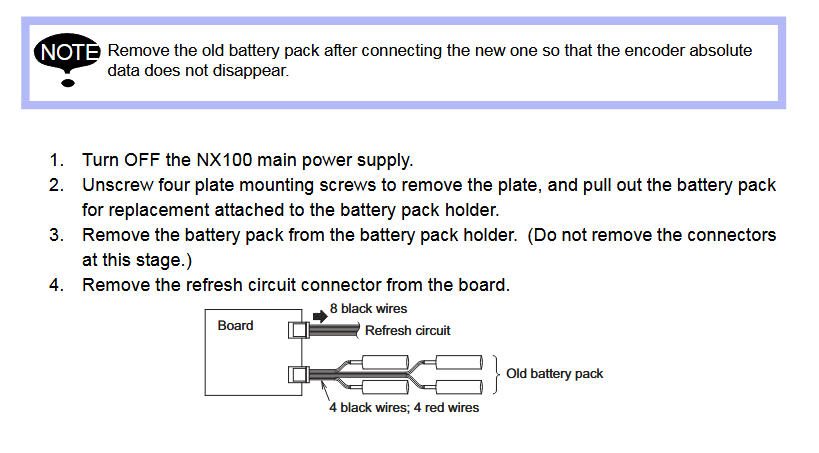 Battery Replacement DIA10 / YR-DIA10-A00 Manipulator October 14, 2025 18:08 Updated Model Covered: YR-DIA10-A00 Material Required:BATTERY SET, MANIP, NX100, W/CONN, 4 BATTERIES HW0470360-A/149689-1 Related articles Grease Procedure (PM) DIA10 / YR-DIA10-A00 Manipulator Parts YRC1000 MICRO SG650 YR-1-04SX650-A00 Manipulator and Controller Comments 0 comments Please sign in to leave a comment.