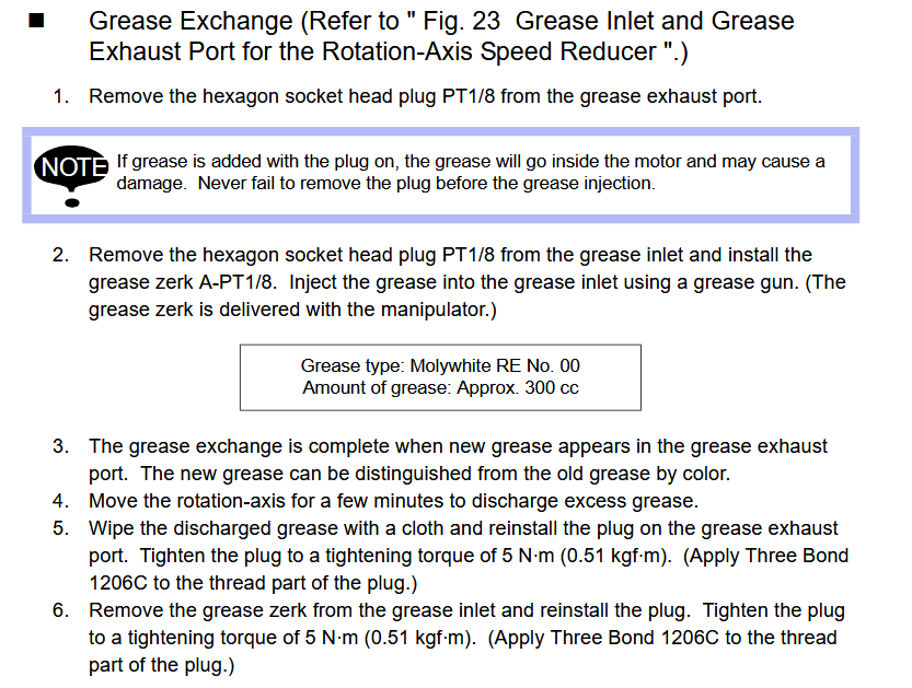 Grease Procedure (PM) DA20 / YR-DA20-A01 Manipulator November 21, 2025 15:27 Updated Model Covered: YR-DA20-A01 Material Required:Molywhite RE No. 00 132412-2Harmonic Grease SK-1A 479035-2 Comments 0 comments Please sign in to leave a comment.