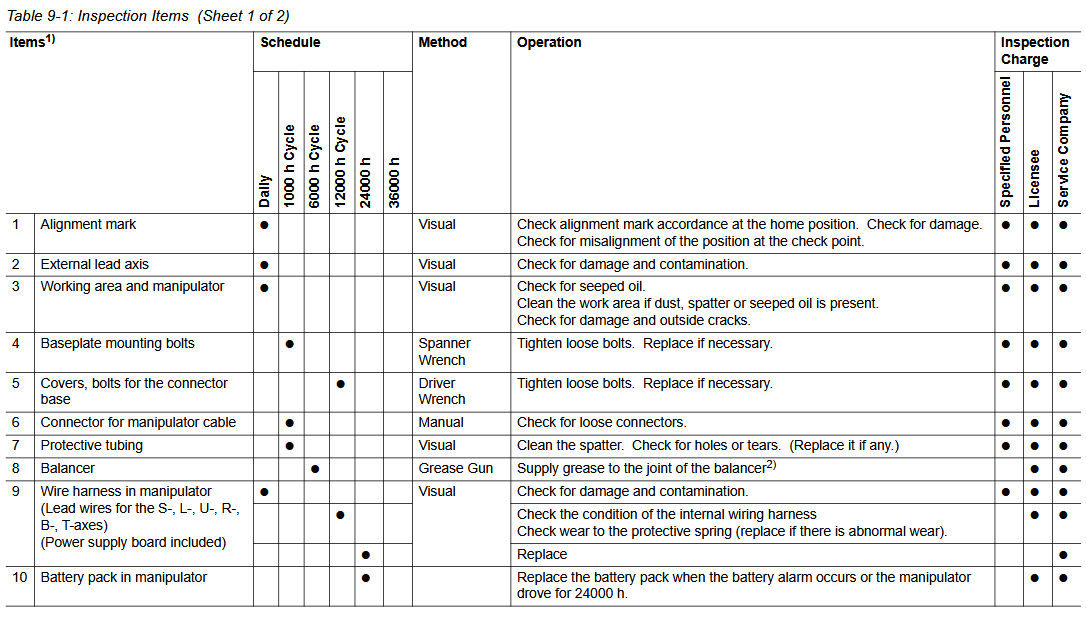 Maintenance Inspection Schedule YRC1000 GP250 / YR-1-06VX250-A00 Manipulator December 10, 2025 19:13 Updated Battery-Replacement-YRC1000-GP250-YR-1-06VX250-A00-ManipulatorGrease-Procedure-PM-GP250-YR-1-06VX250-A00-Manipulator Related articles Grease Procedure (PM) GP250 / YR-1-06VX250-A00 Manipulator Comments 0 comments Please sign in to leave a comment.