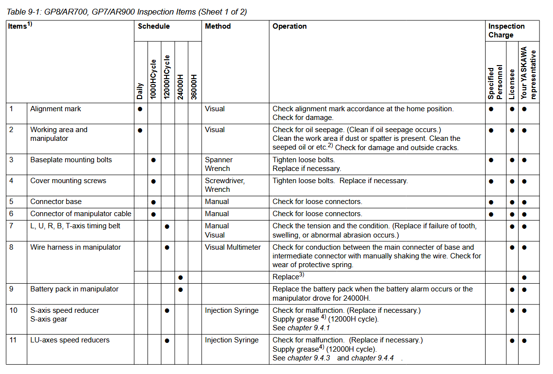 Maintenance Inspection Schedule YRC1000 AR900 / YR-1-06VX7-A00 Manipulator January 07, 2026 20:40 Updated AR900-YR-1-06VX7-A00-Manipulator-Alignment-Mark-LocationsBATTERY-REPLACEMENT-GP8-AR700-MANIPULATORGrease-Replenishment-PM-GP7-YR-1-06VX7-A00 Related articles AR900 / YR-1-06VX7-A00 Manipulator Alignment Mark Locations Maintenance Inspection Schedule YRC1000 AR900 / YR-1-06VX7-B00 Manipulator Parts YRC1000 AR900 / YR-1-06VX7-A00 Manipulator and Controller Parts YRC1000 AR700 / YR-1-06VX8-A00 Manipulator and Controller Parts YRC1000 GP7 YR-1-06VX7-A00 Manipulator and Controller Comments 0 comments Please sign in to leave a comment.