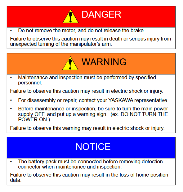 Maintenance Inspection Schedule YRC1000 AR700 / YR-1-06VX8-A00 Manipulator January 07, 2026 20:36 Updated AR700-YR-1-06VX8-A00-Manipulator-Alignment-Mark-LocationsBATTERY-REPLACEMENT-GP8-AR700-MANIPULATORGrease-Replenishment-PM-GP8-YR-1-06VX8-A00 Related articles AR700 / YR-1-06VX8-A00 Manipulator Alignment Mark Locations Maintenance Inspection Schedule YRC1000 AR700 / YR-1-06VX7-B00 Manipulator Comments 0 comments Please sign in to leave a comment.
