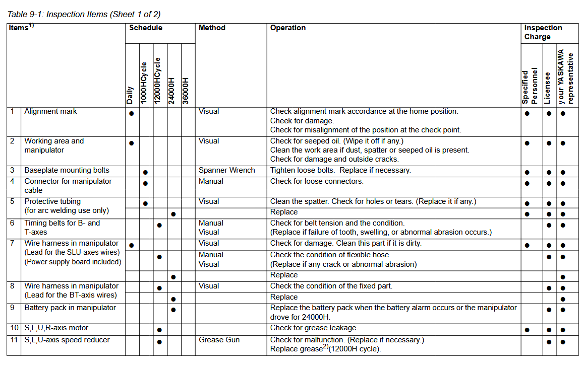 Maintenance Inspection Schedule YRC1000 GP25 / YR-1-06VXH25-A00 Manipulator December 15, 2025 20:23 Updated Battery-Replacement-GP25-YR-1-06VXH25-A00-ManipulatorGrease-Procedure-PM-GP25-YR-1-06VXH25-A00-Manipulator Related articles YRC1000 GP25/ YR-1-06VXH25-A00 Manipulator Alignment Mark Locations Grease Replenishment (PM) GP7/YR-1-06VX7-A00 Battery Replacement GP25 / YR-1-06VXH25-F00 Manipulator Grease Procedure (PM) GP25 / YR-1-06VXH25-A00 Manipulator Battery Replacement GP25/YR-1-06VXH25-A00 Manipulator Comments 0 comments Please sign in to leave a comment.