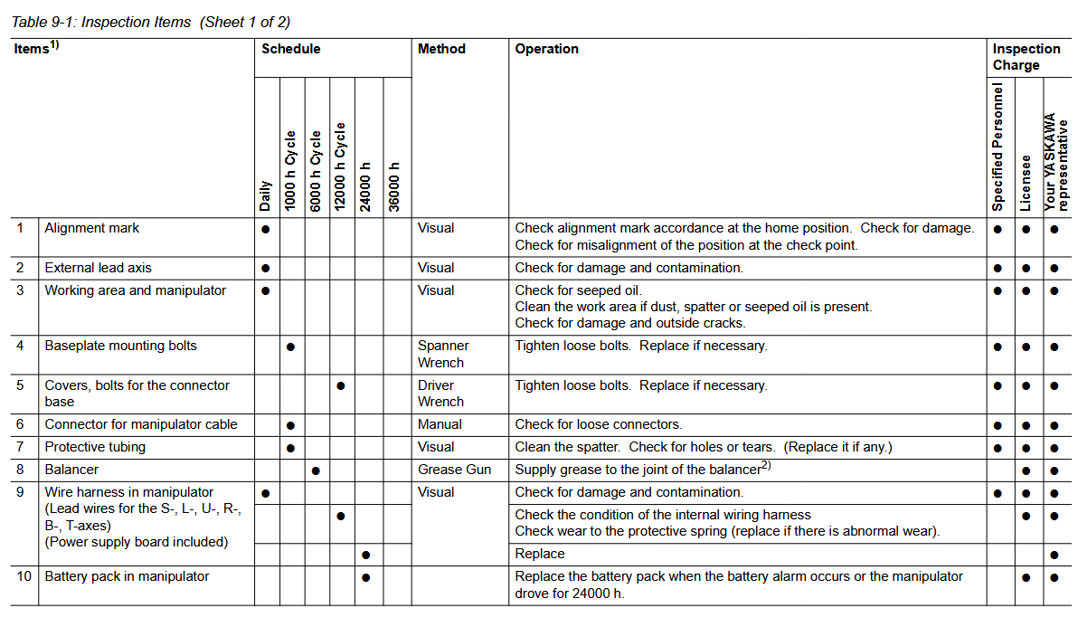 Maintenance Inspection Schedule YRC1000 SP235 / YR-1-06VX250-A00 Manipulator December 19, 2025 16:00 Updated Battery-Replacement-SP235-YR-1-06VX250-A00-ManipulatorGrease-Procedure-PM-SP235-YR-1-06VX250-A00-Manipulator Related articles YRC1000: Instructions Comments 0 comments Please sign in to leave a comment.