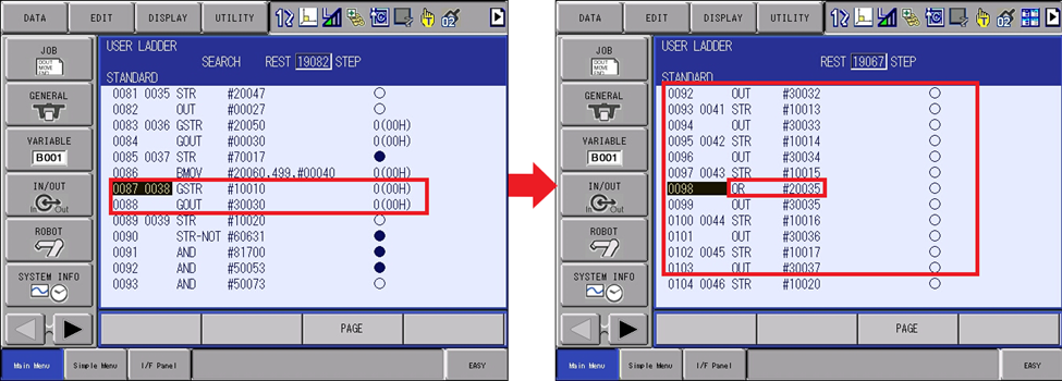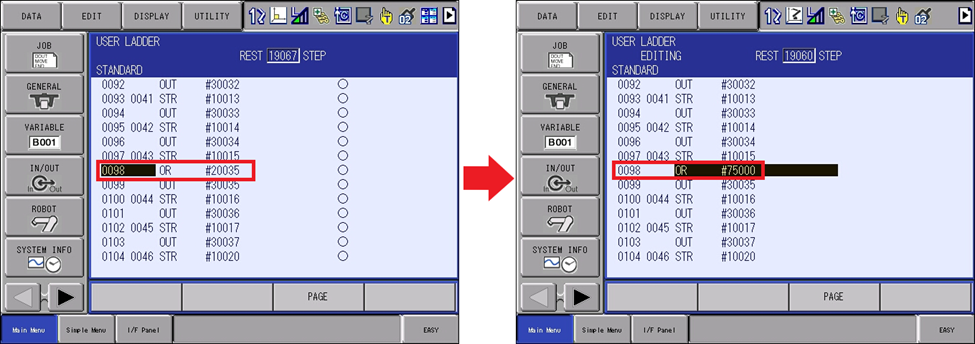 Then navigate back to the rung where the External Input #20035 is used to trigger the LED output (#30035) and change the relays signal to #75000.