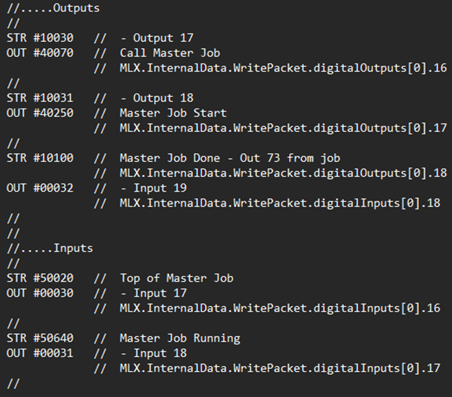 Create a robot controller INFORM job that you would like the MLX300 to execute. The only requirement is that Output 73 is turned on when the job has been completed to notify the PLC software.