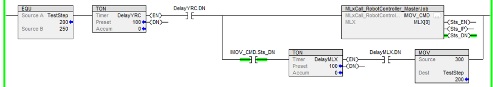 The PLC ladder shown below is an example of the Master Job being called with the IMOV command for an incremental motion. This rung was inserted in between two rungs that had MLX300 motion commands. Timer delays were required before and after the Master Job Call to successfully transition between MLX300 motion and INFORM motion. When the MLxCall_RobotController_MasterJob AOI completes, the .Sts_DN bit will turn on and the logic will continue to the next step.