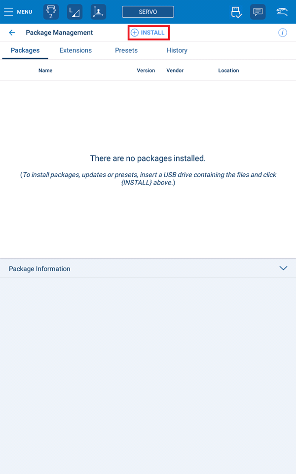 The Installation Packages screen will open and list the new software available on the USB memory stick. Tap the software version to select it and activate the INSTALL button.