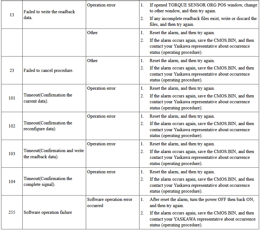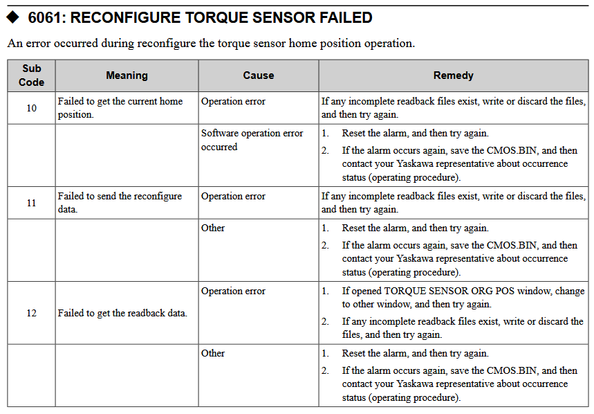 YRC1000MICRO ALARM CODE 6061 RECONFIGURE TORQUE SENSOR FAILED January 12, 2026 20:37 Updated Comments 0 comments Please sign in to leave a comment.