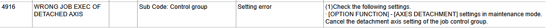 DX200 ALARM CODE 4916 WRONG JOB EXECUTION OF DETACHED AXIS January 29, 2026 18:38 Updated Comments 0 comments Please sign in to leave a comment.