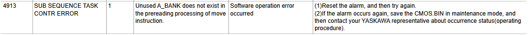 DX200 ALARM CODE 4913 SUB SEQUENCE TASK CONTROL ERROR January 29, 2026 19:01 Updated Comments 0 comments Please sign in to leave a comment.