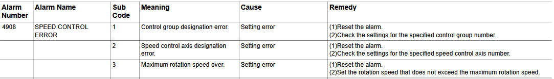 DX200 ALARM CODE 4908 SPEED CONTROL ERROR January 29, 2026 19:07 Updated Related articles DX200 ALARM CODE 4307 SERVO ON DEFECTIVE SPEED Comments 0 comments Please sign in to leave a comment.