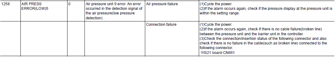 DX200 ALARM CODE 1258 AIR PRESS ERROR (LOW) 5 February 03, 2026 16:50 Updated Related articles YRC1000 ALARM CODE 6039 GAS PRESSURE CHECK SETTING ERROR Comments 0 comments Please sign in to leave a comment.