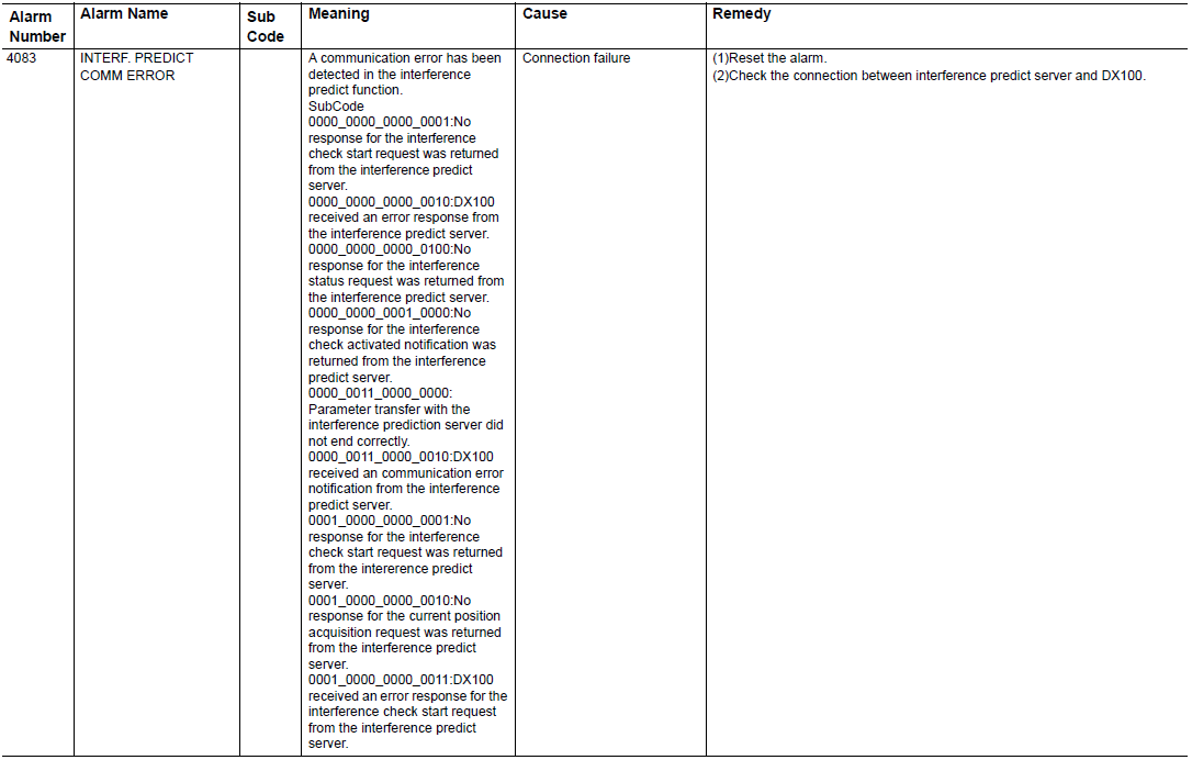 DX100 ALARM CODE 4083 INTERFERENCE PREDICT COMM ERROR February 03, 2026 20:33 Updated Comments 0 comments Please sign in to leave a comment.