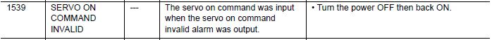 NX100 ALARM CODE 1539 SERVO ON COMMAND INVALID February 05, 2026 13:21 Updated Comments 0 comments Please sign in to leave a comment.