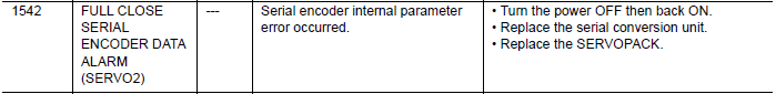 NX100 ALARM CODE 1542 FULL CLOSE SERIAL ENCODER DATA ALARM (SERVO 2) February 05, 2026 13:41 Updated Comments 0 comments Please sign in to leave a comment.