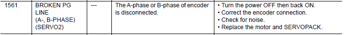 NX100 ALARM CODE 1561 BROKEN PG LINE (A-B-PHASE) (SERVO 2) February 05, 2026 16:39 Updated Comments 0 comments Please sign in to leave a comment.