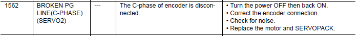 NX100 ALARM CODE 1562 BROKEN PG LINE (C-PHASE) (SERVO 2) February 05, 2026 16:43 Updated Comments 0 comments Please sign in to leave a comment.