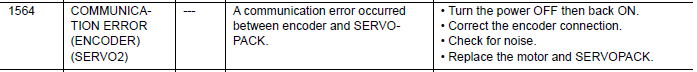 NX100 ALARM CODE 1564 COMMUNICATION ERROR (ENCODER) (SERVO 2) February 05, 2026 16:52 Updated Comments 0 comments Please sign in to leave a comment.