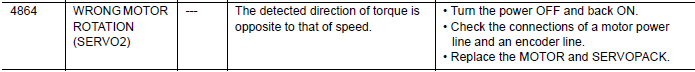 NX100 ALARM CODE 4864 WRONG MOTOR ROTATION (SERVO 2) February 05, 2026 20:35 Updated Comments 0 comments Please sign in to leave a comment.