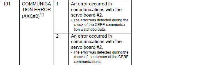 NXC100 ALARM CODE 0101 COMMUNICATION ERROR (AXC#2) February 06, 2026 16:35 Updated Related articles NXC100 ALARM CODE 4634 FOLLOWING SPEED OVER Comments 0 comments Please sign in to leave a comment.