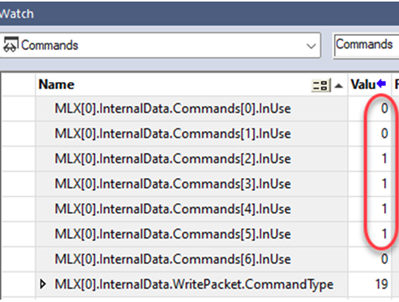 A watch window can be setup to view all the queue index locations. The example below shows that there were 6 commands in the queue, and the first two have already executed. The third command is currently executing. The bottom tag show the Command Type of the AOI currently executing or if the controller is E-Stopped, it shows the last command that executed.