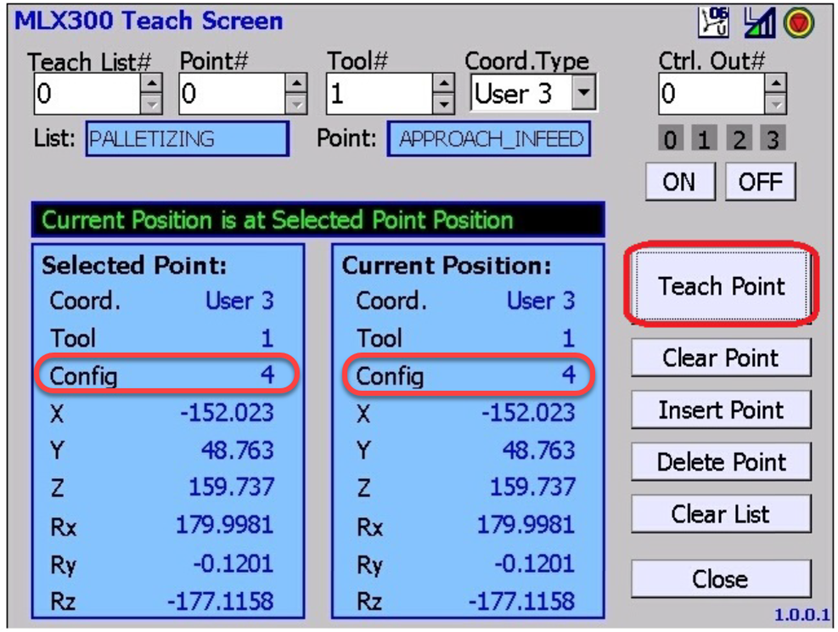 When you teach a point on the MLX300 Teach screen, the “Current Position” data will be sent to the PLC and the screen will update with same data shown under the “Selected Point” data. The Example below shows the Config data is 4.