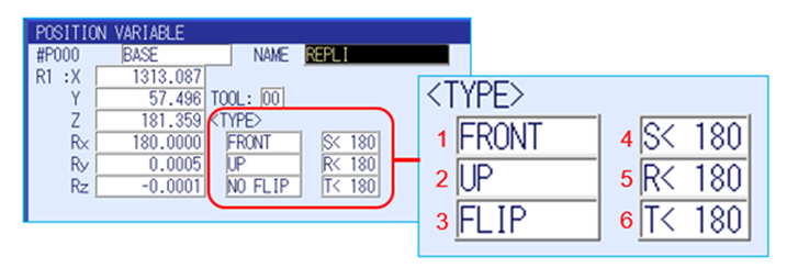 Referring to the position variable data shown on the robot pendant, the “Type” data explains the pose of the robot for the TCP location.
