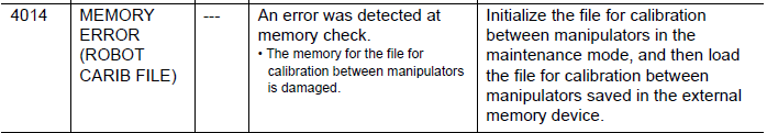 NXC100 ALARM CODE 4014 MEMORY ERROR (ROBOT CALIBRATION FILE) February 17, 2026 14:46 Updated Comments 0 comments Please sign in to leave a comment.