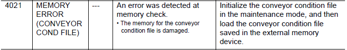 NXC100 ALARM CODE 4021 MEMORY ERROR (CONVEYOR COND FILE) February 17, 2026 15:07 Updated Comments 0 comments Please sign in to leave a comment.