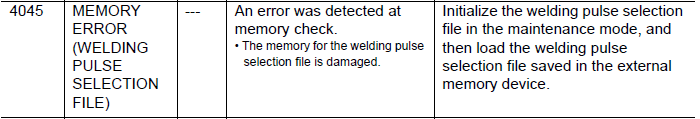 NXC100 ALARM CODE 4045 MEMORY ERROR (WELDING PULSE SELECTION FILE) February 17, 2026 18:03 Updated Comments 0 comments Please sign in to leave a comment.