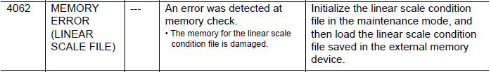 NXC100 ALARM CODE 4062 MEMORY ERROR (LINEAR SCALE FILE) February 17, 2026 21:09 Updated Comments 0 comments Please sign in to leave a comment.